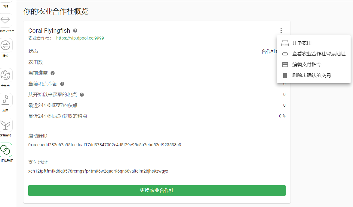 - 点击合作社,选择需要切换的启动器切换合作社,输入接入地址:https://vip.dpool.cc:9999