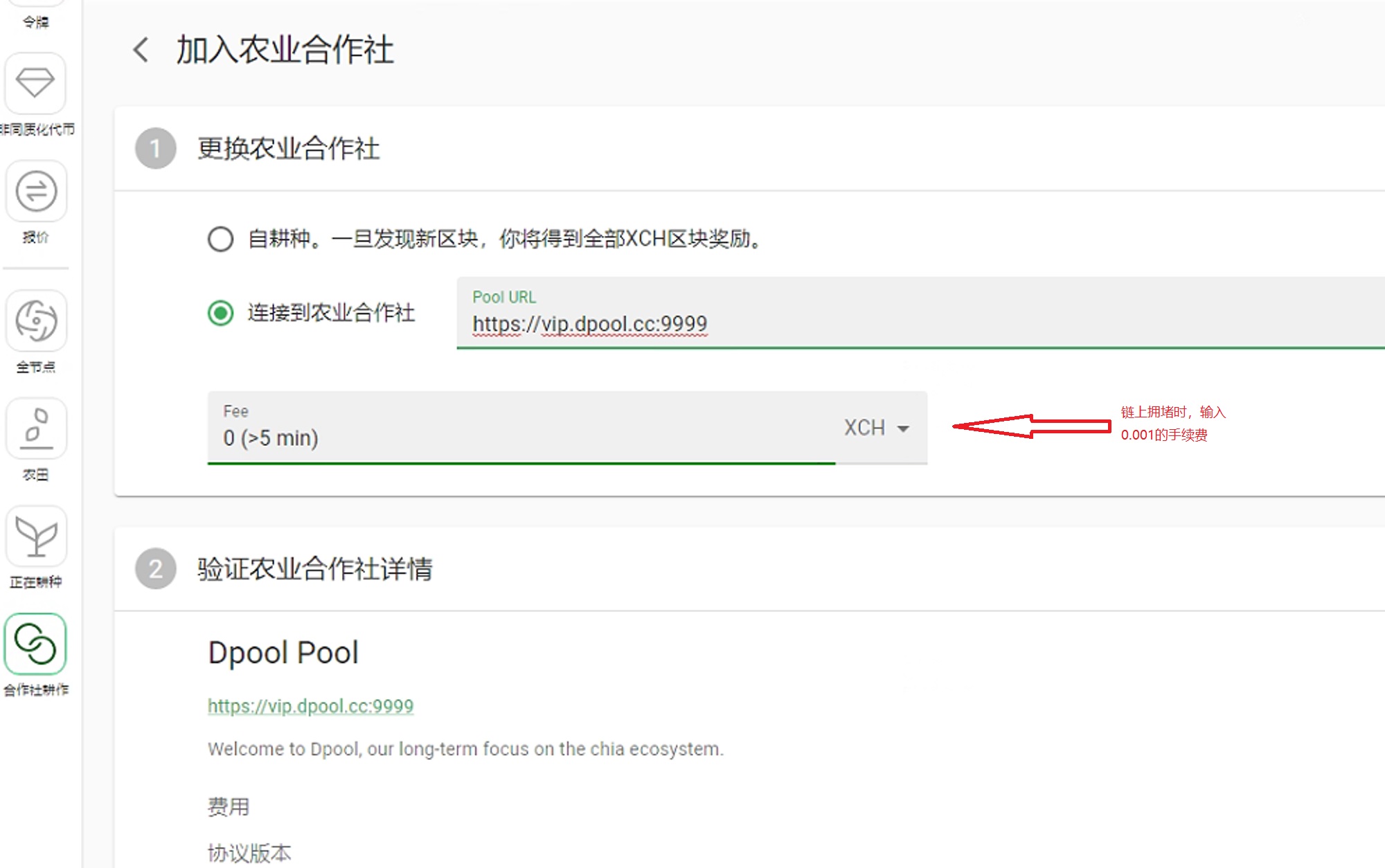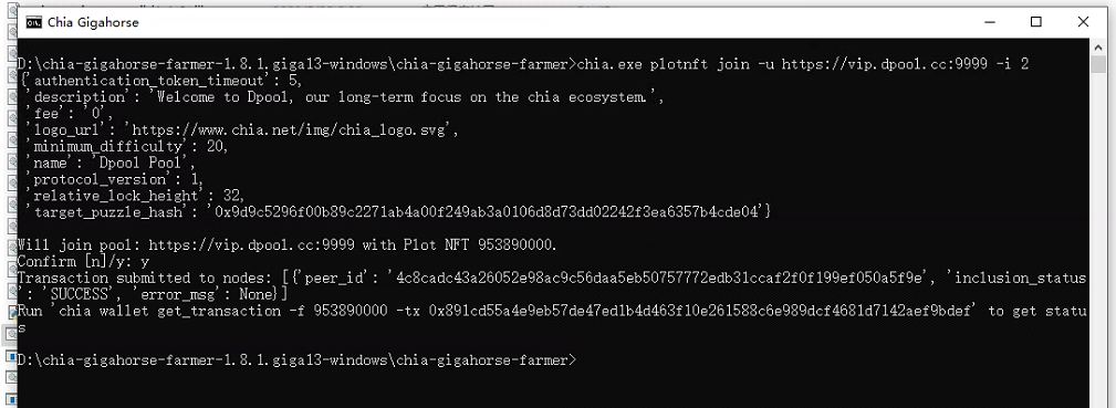 - chia.exe plotnft join -u https://vip.dpool.cc:9999 -i 2 -m 0.001