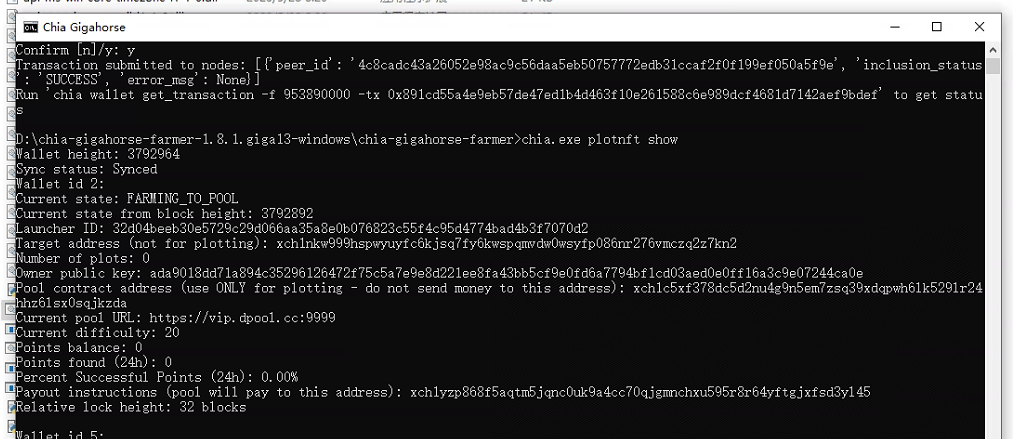 - 等待15分钟左右,再次查看启动器信息检查: chia.exe plotnft show , 当前启动器状态已经切换到矿池(FARMING_TO_POOL)