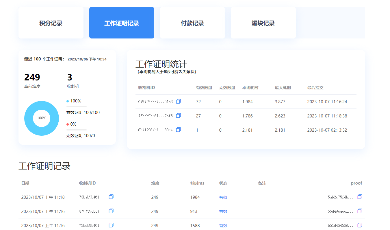 工作证明记录统计每个收割机的信息(有效证明数量、耗时、最后提交时间),通过分析这些指标找到异常的收割机ID,查看对应收割机的日志分析原因